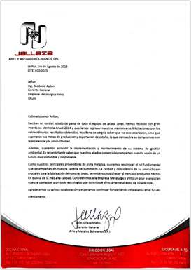 La Empresa «Jallaza Joyas – Arte y Metales S.R.L.», cliente nacional de la Empresa Metalúrgica Vinto, hizo llegar a la Gerencia General sus felicitaciones por los resultados obtenidos la gestión 2024, destacando el compromiso con la excelencia y la calidad, de todo el equipo humano que integra la Fundición orureña.