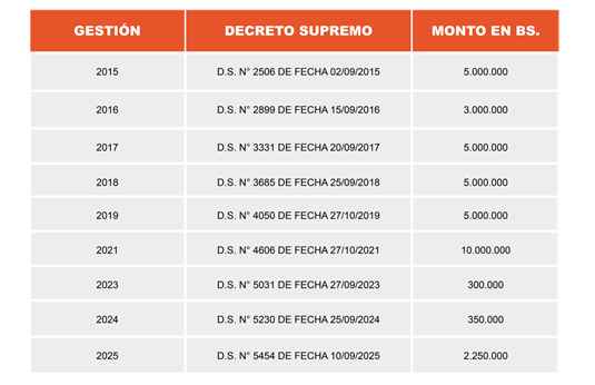 El año 2025 mediante Decreto Supremo N° 5454 de fecha 10 de septiembre del 2025, la Empresa Metalúrgica Vinto destinó Bs. 2.250.000 millones al pago del Bono Juancito Pinto.